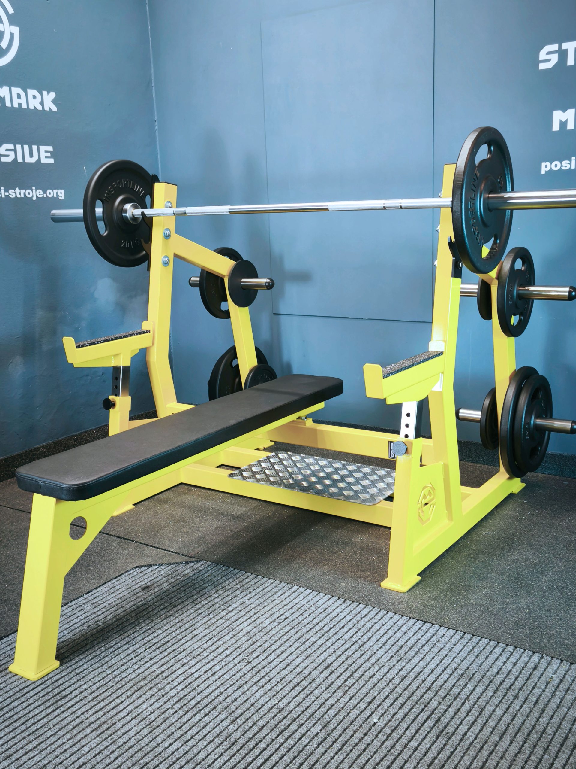 Posilovací lavička s bezpečnostním stavitelným dorazem určená pro cvičení s Olympijskou činkou do hmotnosti 250kg.