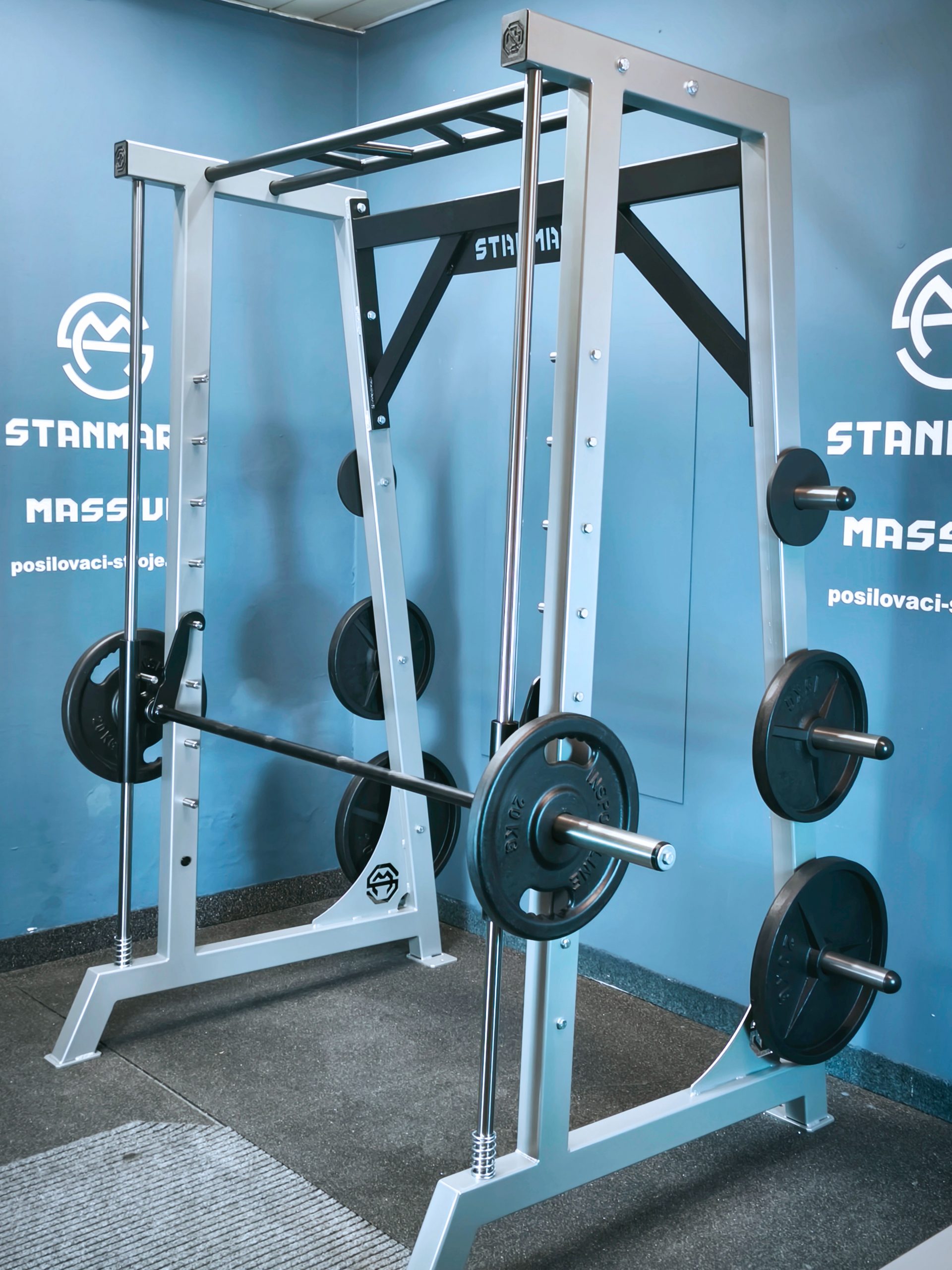 Posilovací stroj určený pro izolované procvičení stehenních svalů, jehož největší výhodou je fixace bederní část zad i při hlubokém dřepu. Stavitelná nerezová platforma